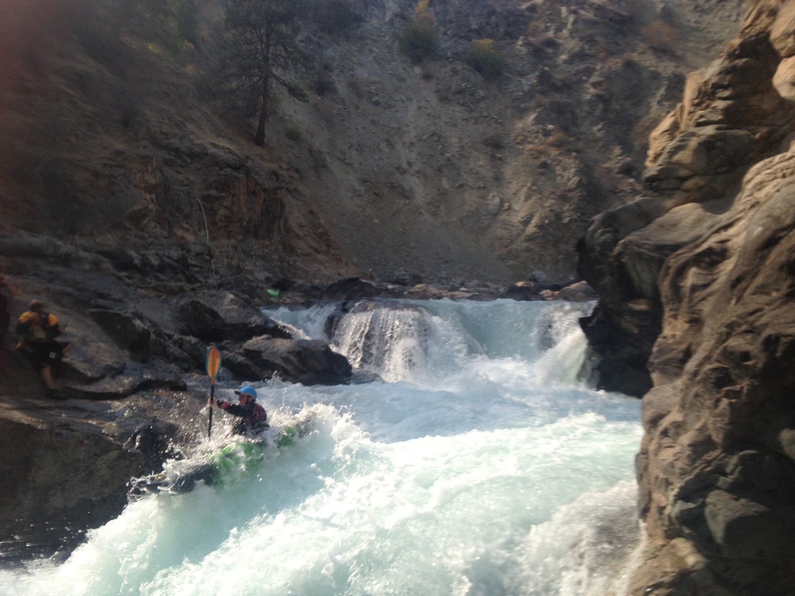 A week or two after settling into my new home I kicked off my Washington kayaking career by linking up with the other Wigston and heading to the elusive Chelan Gorge. The Chelan Gorge is a very special run. After years of hard work and research the local crew here was able to negotiate a recreational release each year for a weekend in September. The timing of the release couldn't be better as many of the other run are getting to low and the weather is nice and hot! The town of Chelan welcomes the kayakers in and puts everyone up at the local baseball field, which happens to be right at the put in. Running water, a place to go number 1 and number 2, and a place to pitch a tent right in town....can't beat it! At 10am a little man comes out of his house to turn the water, he pats his hand on his helmet telling us he is ok and then we get to walk right past the no trespassing signs. What a cool event!